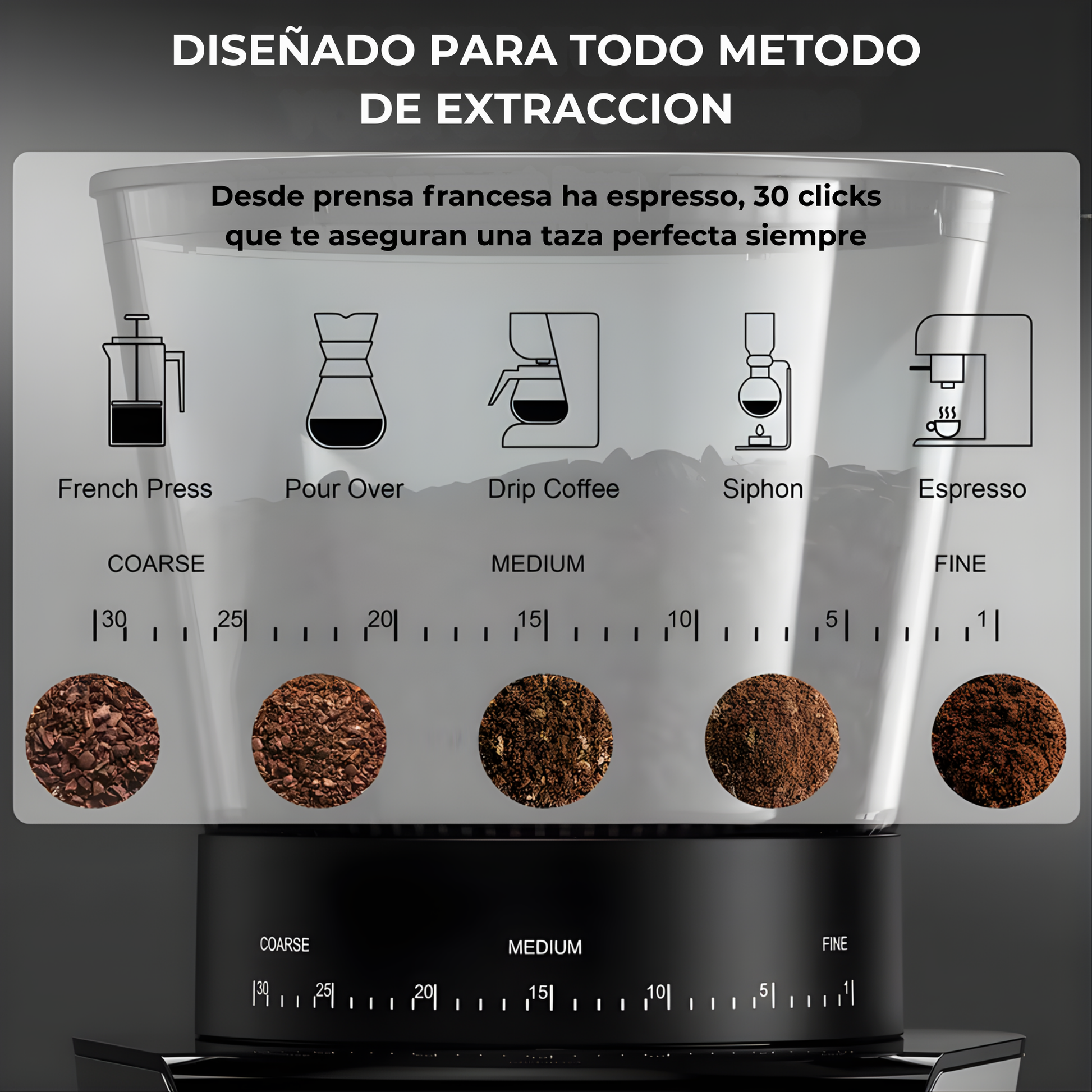 Permite seleccionar desde molienda ultrafina para Espresso hasta una molienda gruesa ideal para French Press. Se adapta perfectamente a métodos como Pour Over, Drip, Cold Brew, Moka y más. -