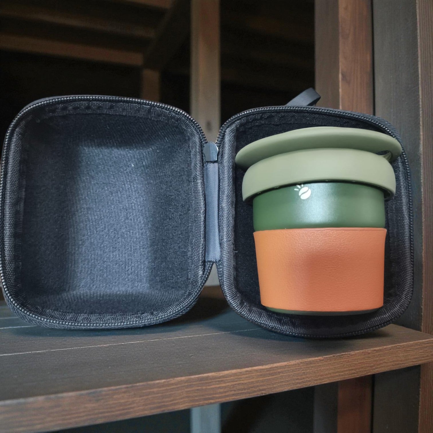 El filtro de silicona plegable de grado alimenticio es la estrella del kit: se encoge en segundos para guardarse fácilmente en su estuche rígido, ideal para transportar sin preocupaciones. La taza y el frasco para café están fabricados en acero inoxidable, asegurando durabilidad, higiene y resistencia incluso en uso constante.